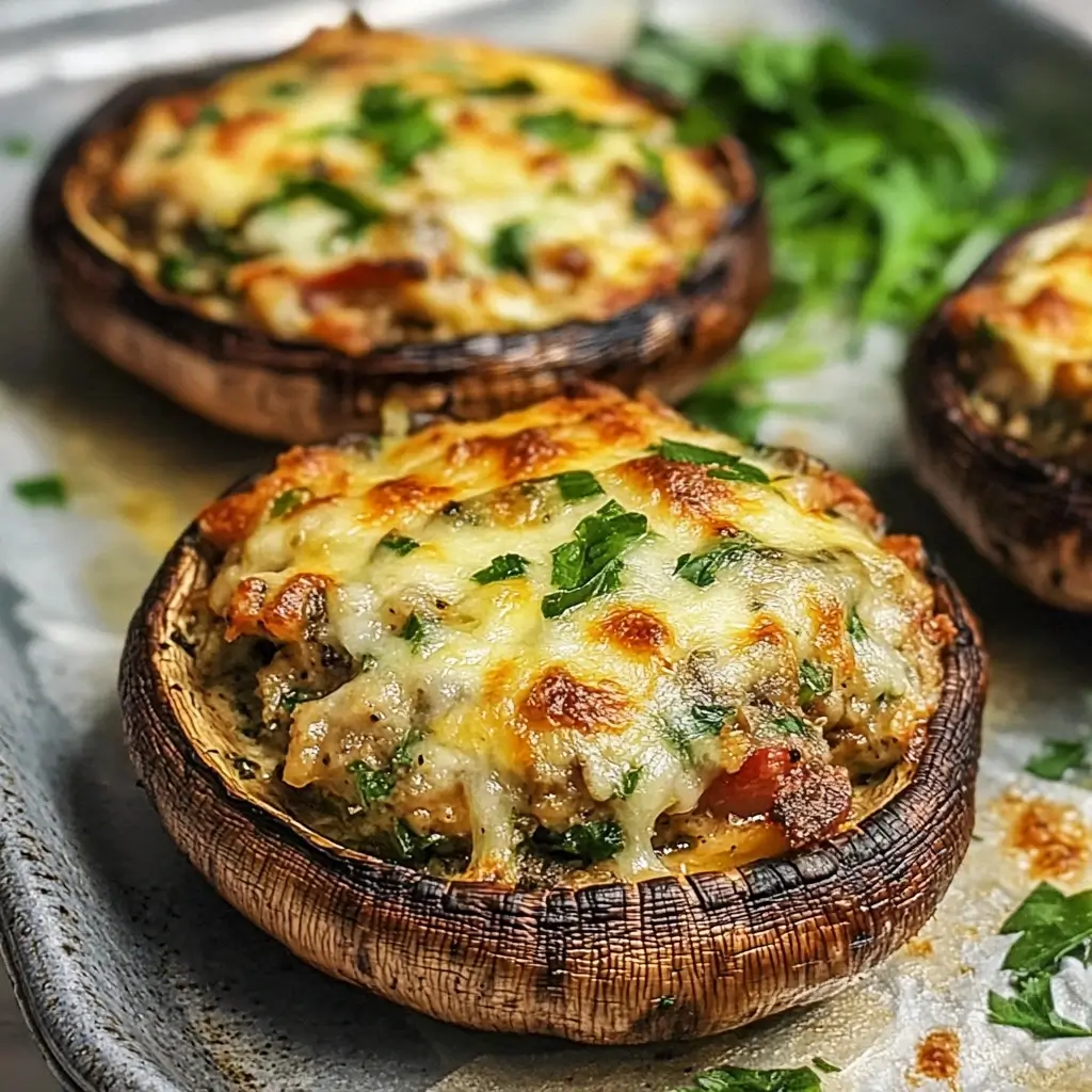 - Rest and Serve: Let the stuffed portobello caps rest on the baking sheet for a few minutes before serving. This allows the filling to set up a bit and makes them easier to handle. Garnish with fresh parsley if desired and serve hot.